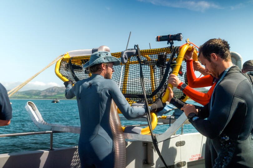 The bright yellow seagrass harvester prototype, nicknamed Thunderbird 4, was trialled in one of the UK’s last remaining seagrass sites, in North Wales.  The prototype proved to be effective in collecting seedpods in the twin-barrel filter system and from that small collection of seedpods, a scalable future began to take shape.