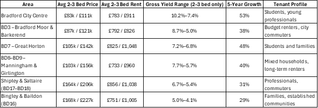 For investors reviewing where to focus their search, the full district-by-district breakdown, including yield variations, demand patterns and five-year growth trends, is explored in our Bradford buy-to-let market analysis.