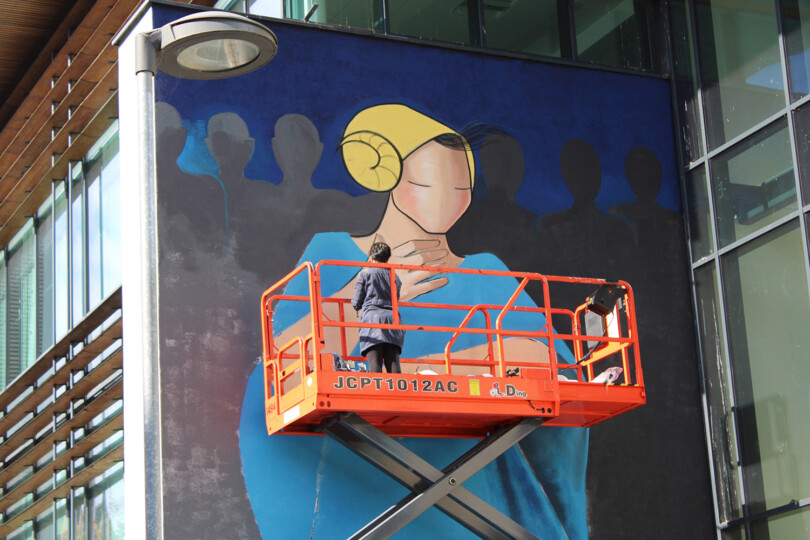 Graffiti artist Shamsia Hassani working on an aerial work platform at Bradford College.