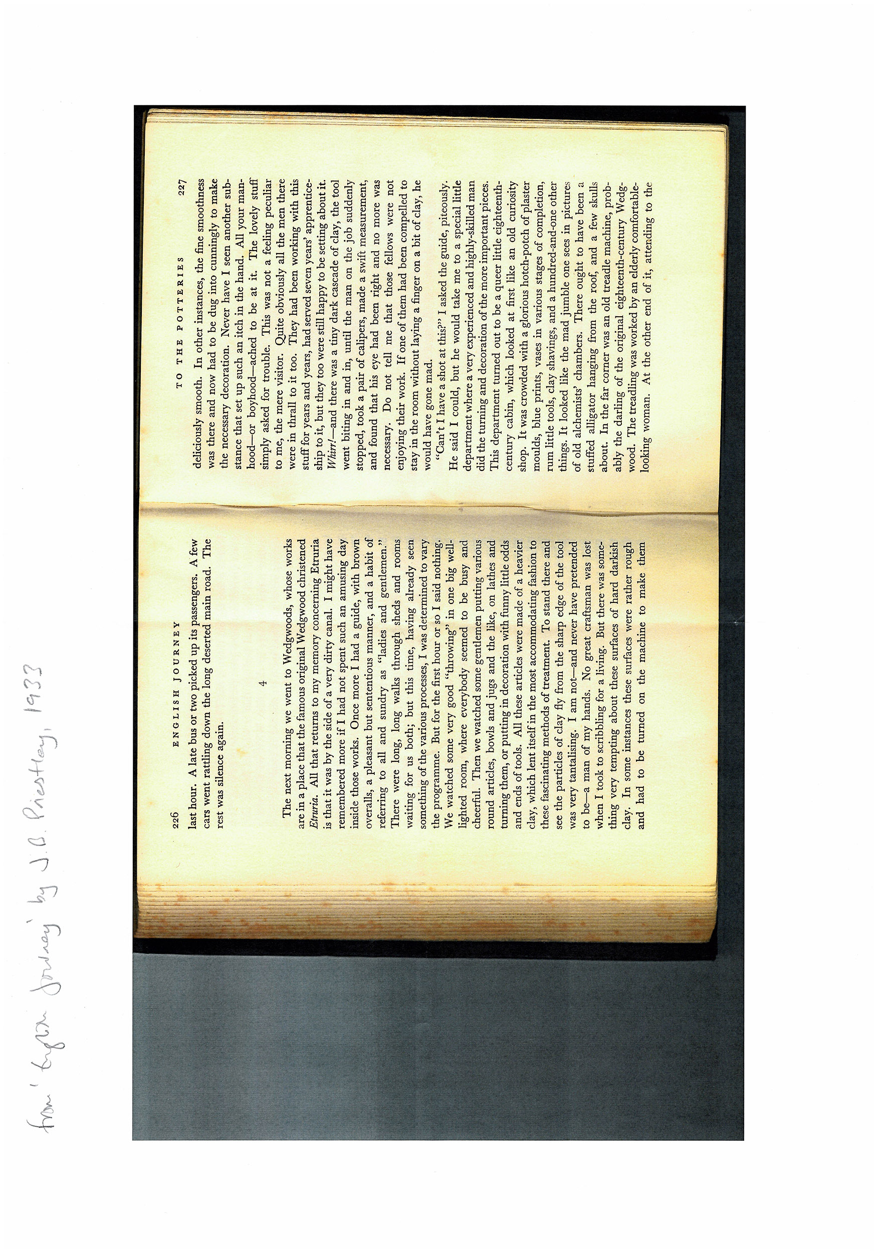 In his 1934 account, Priestley recalls visiting the famous Wedgewood pottery factory and trying his hand at decorating his own vase, noting it was much harder than it looked.