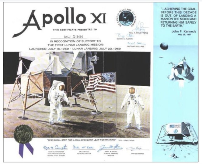 Certificate awarded to Mike Dinn in recognition of his service regarding the televisation of the moon landings. Images c/o Mike Dinn