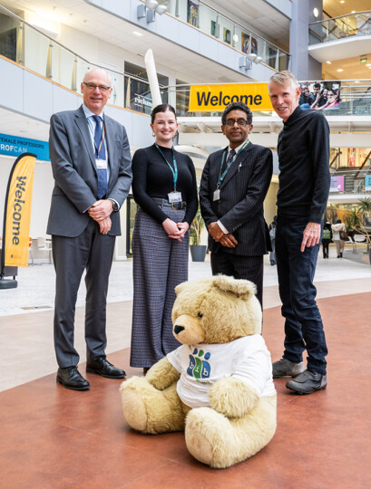 From left, Professor Nick Braisby, University of Bradford Interim Vice-Chancellor, Lydia Ngwenya, Senior Alumni & Philanthropy Manager at the University of Bradford, Professor Prathivadi Anand, Professor of Public Policy and Sustainable Development at the University of Bradford and BiB team member, Professor John Wright, Born in Bradford’s Chief Investigator, with the Born in Bradford teddy bear. Images credit: Kiran Metha@KM Images Ltd