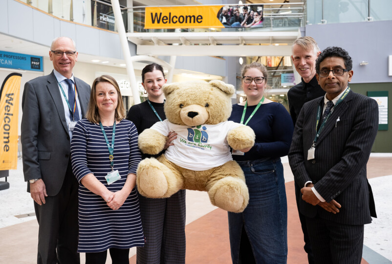 From left, Professor Nick Braisby, University of Bradford Interim Vice-Chancellor, Eleanor Clyde-Evans, Associate Director, Engagement, Development and Communications at the University of Bradford, Lydia Ngwenya, Senior Alumni & Philanthropy Manager at the University of Bradford, the Born in Bradford teddy bear, Katie Swinden, Born in Bradford Business Operations Manager, Professor John Wright, Born in Bradford’s Chief Investigator, and Professor Prathivadi Anand, Professor of Public Policy and Sustainable Development at the University of Bradford and BiB team member. Images credit: Kiran Metha@KM Images Ltd