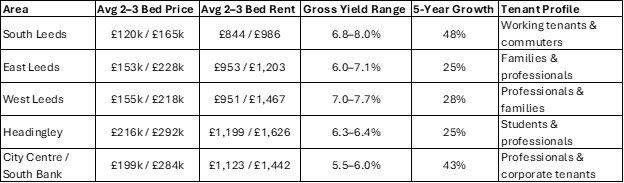We now break this down area by area, highlighting how local pricing, rental demand and renovation potential vary across Leeds’ most active neighbourhoods.