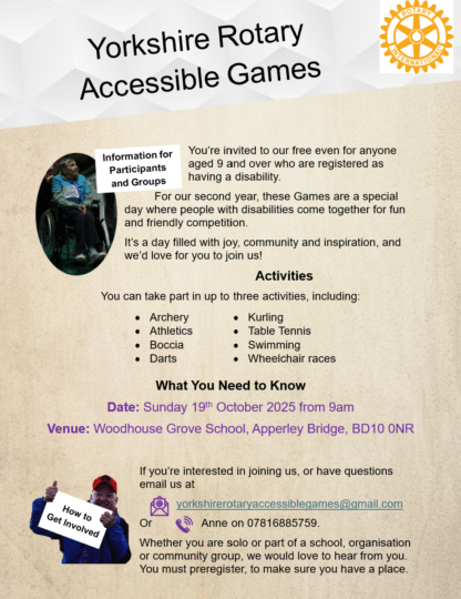 For information and entry forms, please contact Anne on yorkshirerotaryaccessiblegames@gmail.com Hope to see you there.